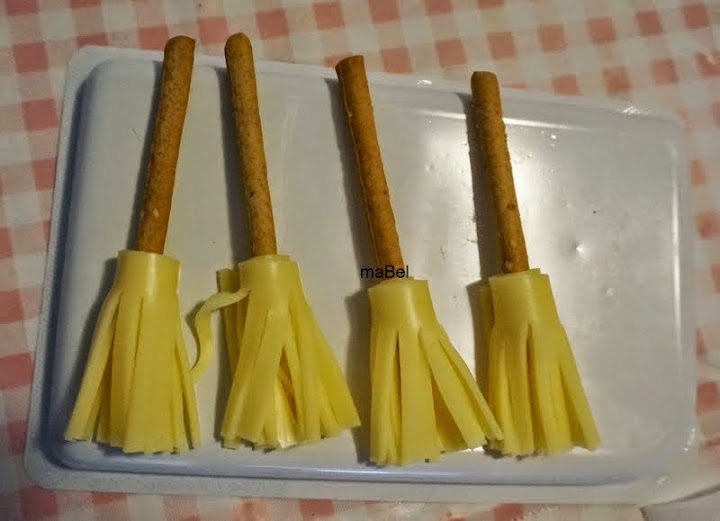 3.- Las lonchas de queso, las corto por la mitad, por lo que una sola loncha me alcanza para 2 escobitas. Lo mismo hago con los palitos de pan. Yo los compro, los mas finitos que hay en el mercado, y usé los tipo integral porque me venían muy bien. Si quieres hacer los palitos en casa, te dejo esta receta de grissini (ver receta)