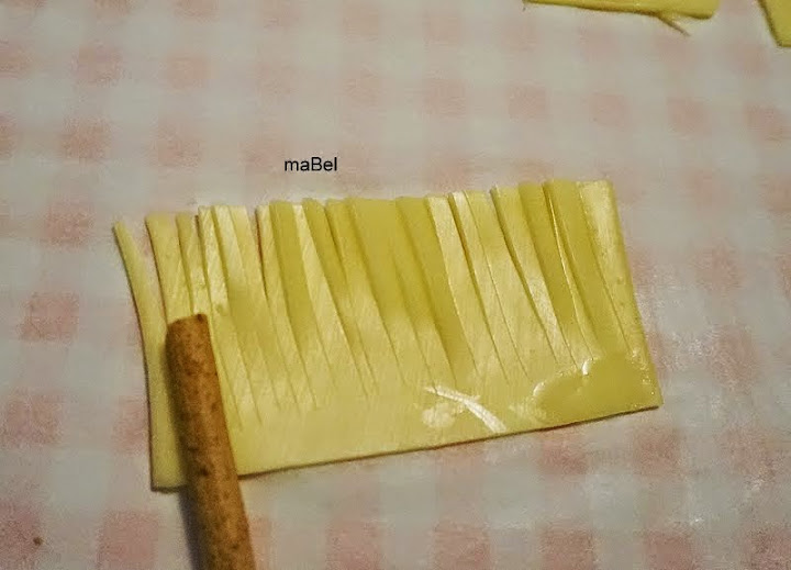 Cortar tiras en la loncha de queso, a lo largo. Los cortes que vayan mas o menos desde un poco mas de la mitad hacia afuera. Corta desde dentro del queso para fuera, así controlas mejor el corte, si tienes una ruedita de las de cortar pizza o las de cortar fondant, te ayudan un montón, pero sino con tijera o cuchillo
