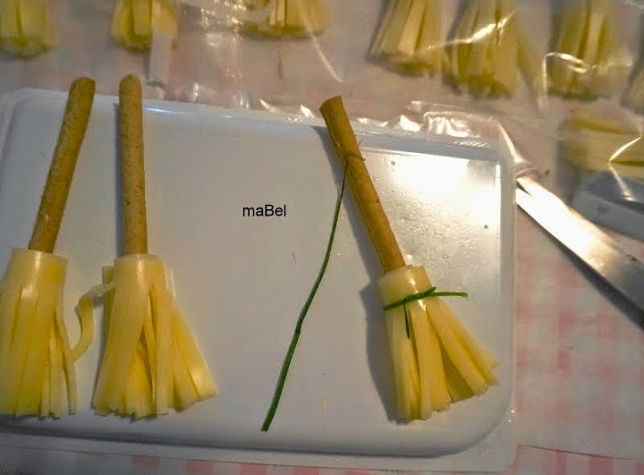 2.- El cebollino lo usaremos para atar las escobitas, no es necesario, pero quedan muy bonitos. Pon en un bol, 2 tazas de agua hirviendo con una pizca de bicarbonato, introduce los cebolinos, en unos segundos nada mas, cuando veas que los cebollinos pierden la firmeza, los cuelas y los pasas por agua fría.